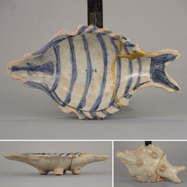 - 〔聖〕唐物 明時代 末期 景徳鎮窯 厚手 古染付『 染付 魚形 三足 向付 』茶道具 茶懐石 鉢【料理屋 料亭 中国 古玩 魯山人 白洲正子 民藝】