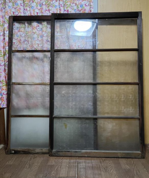 > ミ★☆ 希少!! サッシ 腰窓(中) 引き戸 ★建具 ★ リノベーション 約136.5cm(高さ) × 87cm(幅)×2枚 アンティーク柄ガラス☆★彡