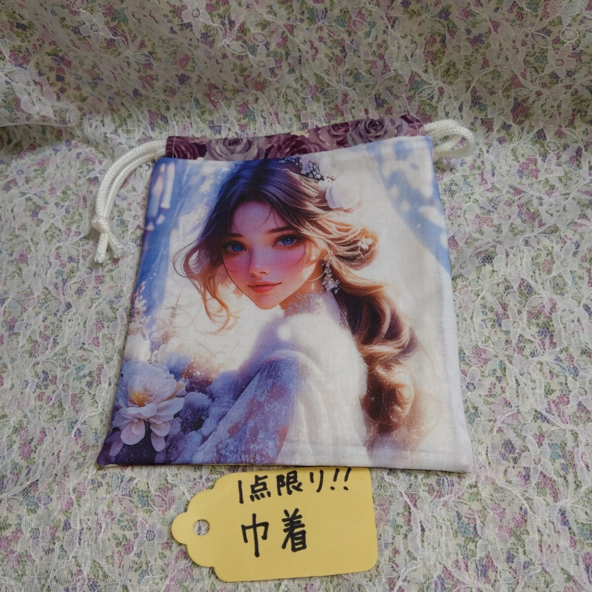 - 1点限り巾着 洋装美人 紫薔薇 パネル生地 可愛い ハンドメイド
