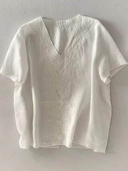 > 25nc トップス チュニック フリーサイズ ナチュラル 麻100% リネン RINEN サラサラ ゆったり 刺Vネック 上品 大人可愛 白色