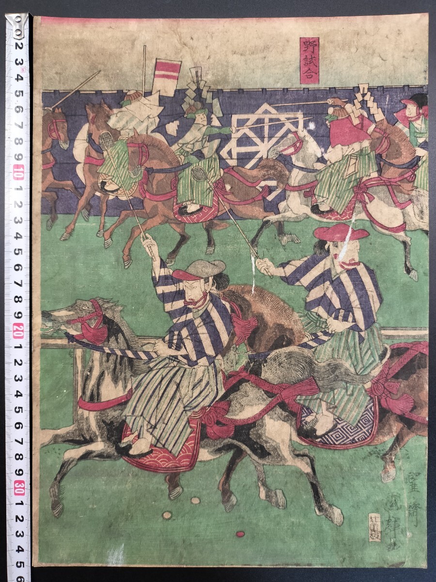 - 明治期/真作 歌川国輝「野試合」本物浮世絵木版画 武者絵 錦絵 大判 裏打ち