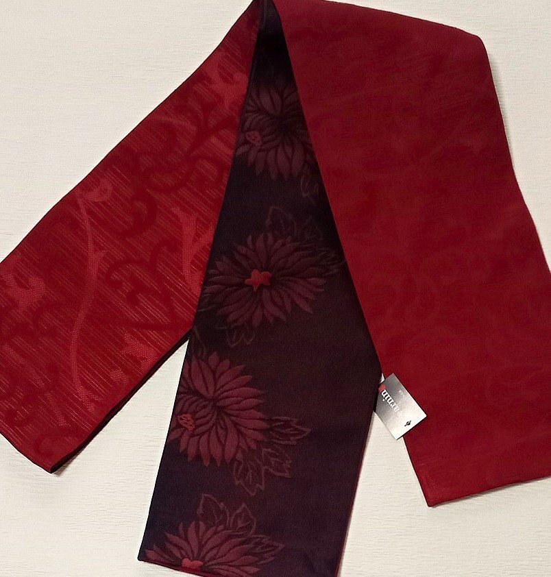 > 7849 両面半幅帯(細帯)【ワインレッド・大菊】-