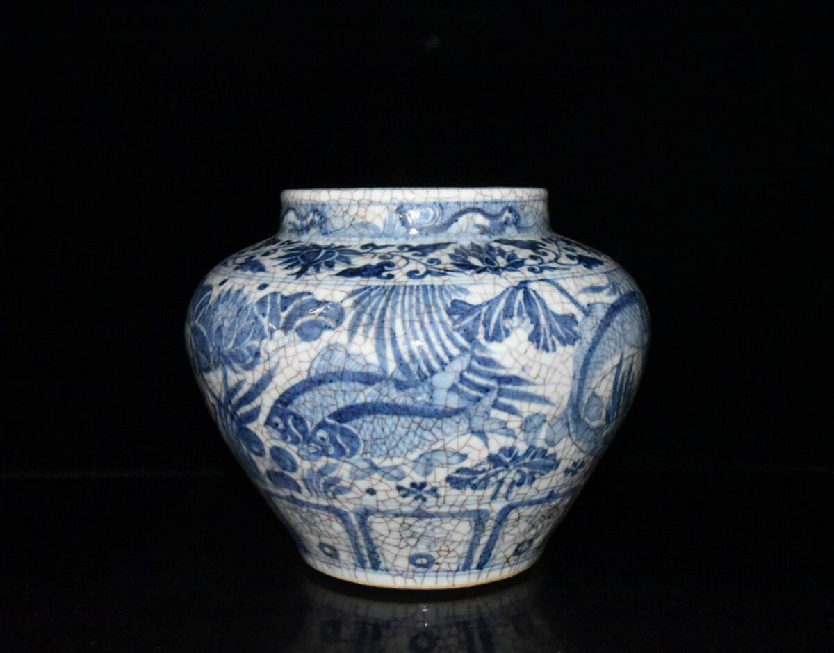- 【超珍館蔵】元 古陶瓷品 青花 開片 魚藻紋罐 陶藝 古賞物 古董品 古美術品 時代物 旧家蔵出 稀少珍蔵品