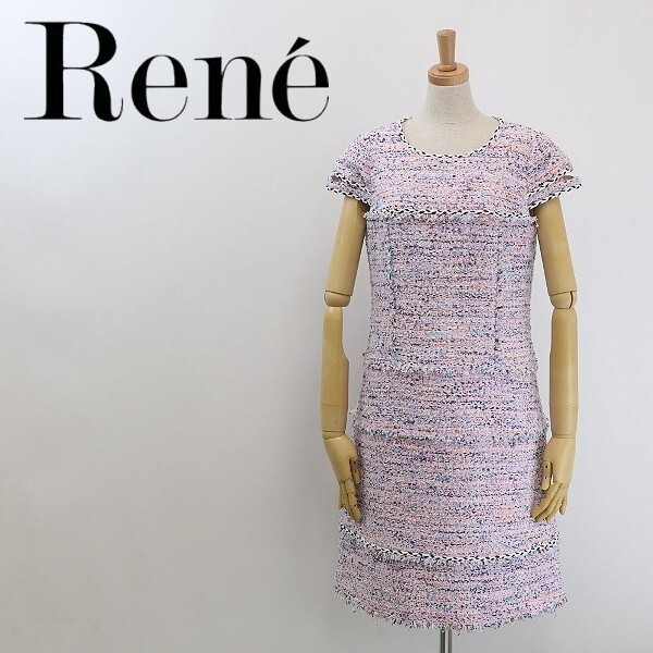 > 【HA168】美品◆Rene ルネ TISSUE社 ミックスツイード テープ使い カットスリーブ ワンピース