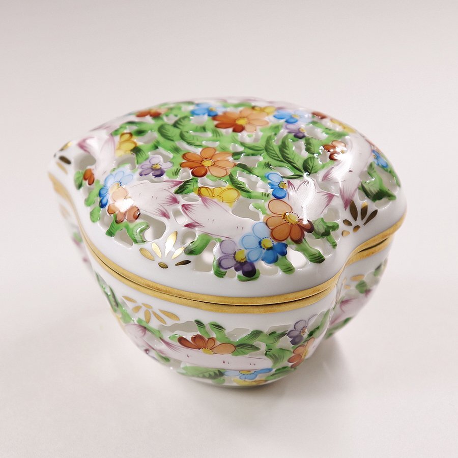 ハート形のスモールボックス。身と蓋全面に透かしが付けられており、繊細な造形と絵付けの様子が窺えます。 身は「G202-2-00/C J 2002 81」、蓋は「G202-3-00/C J 2002 81」のナンバーが見られます。
