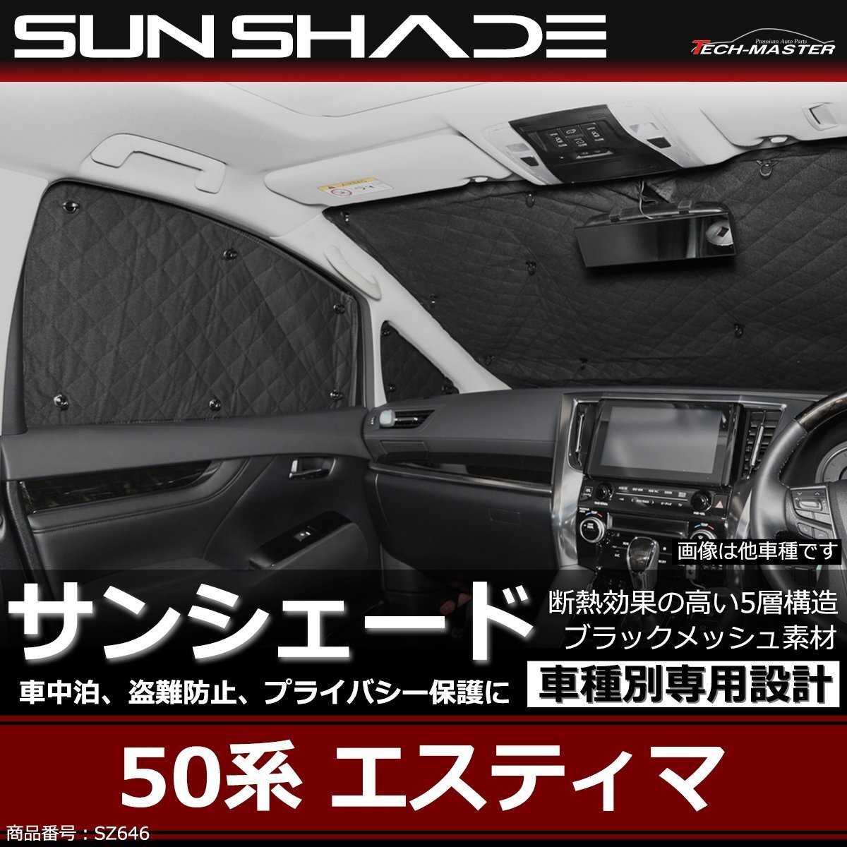 - 50系 エスティマ サンシェード 全窓用 5層構造 ブラックメッシュ 車中泊 アウトドア 日よけ SZ646