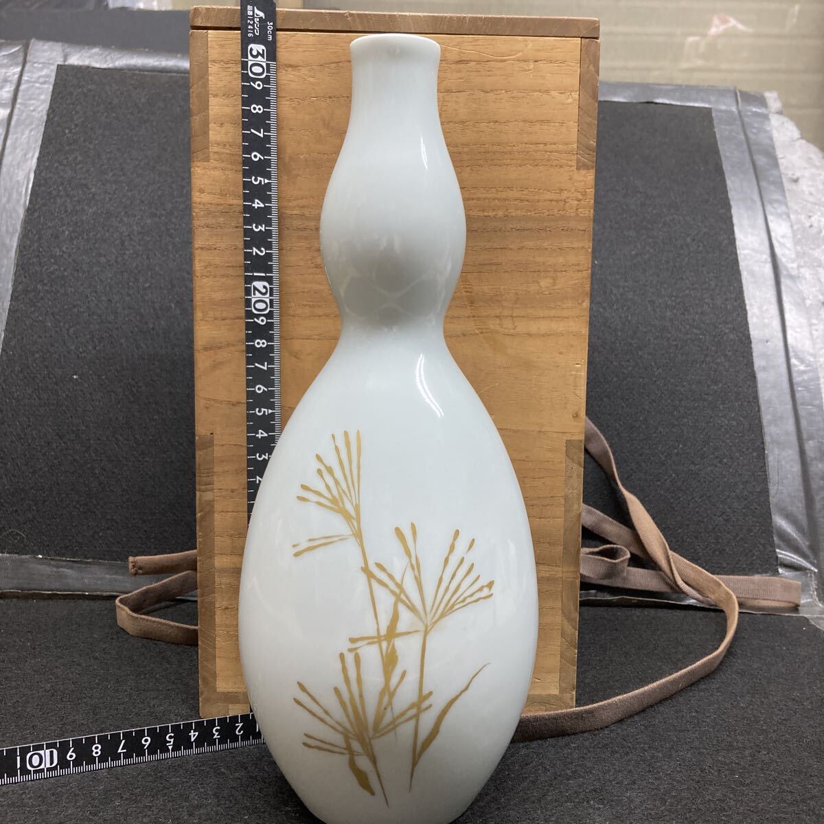 - 京焼き 岡本為治造(物故作家)白磁 瓢箪形 金彩草絵 花瓶アンテーク 高さ約30センチ 径約12センチ 合い箱付き 師(河村蜻山)
