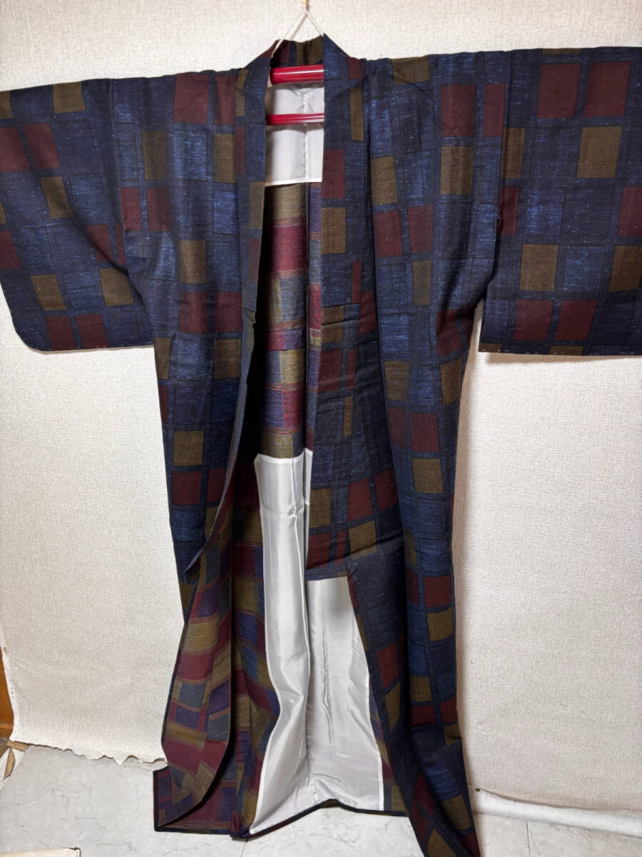 - d4636◆しつけ糸付き未使用◆冬物 厚手 着物 居敷当て付き単衣 青×茶◆肩身丈158cm裄62cm