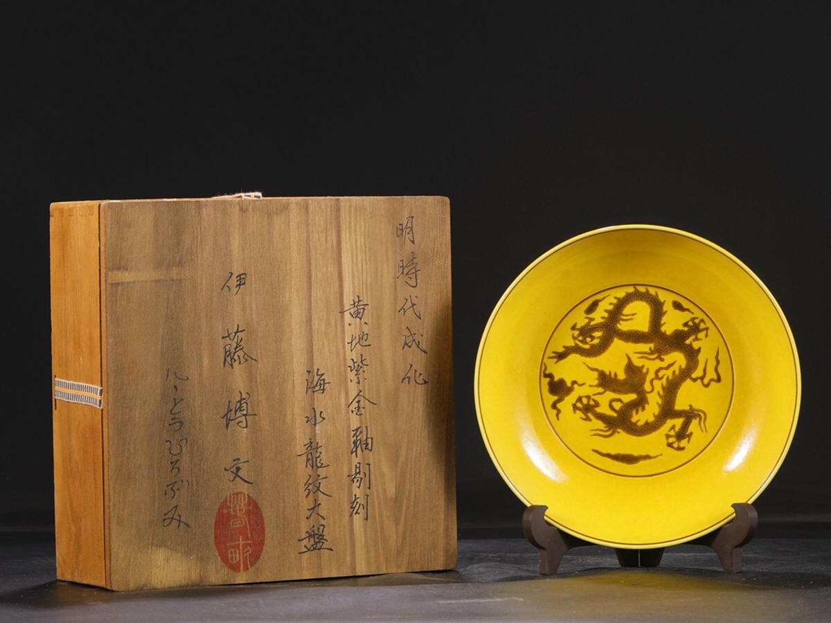 - 「明 成化年製 陶磁器 黄地紫金釉剔刻海水龍紋 大盤」染付 置物 擺件 古賞物 中国古美術 旧蔵出