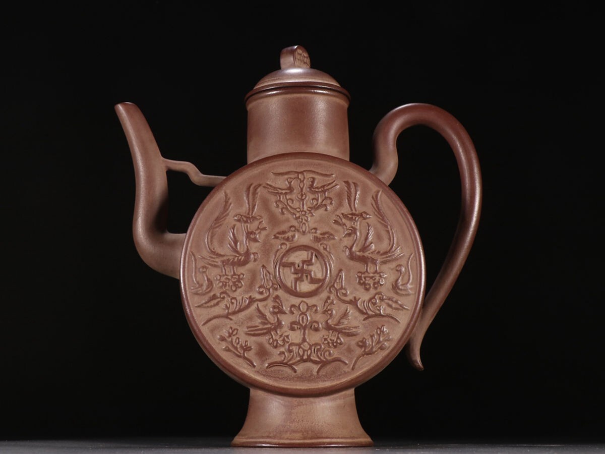 - 【瓏】紫砂彫 百鳥朝鳳酒壺 貢局銘 清時代 中国陶磁器 陶芸 後手急須 茶壷 茶道具 置物 古美術 蔵出