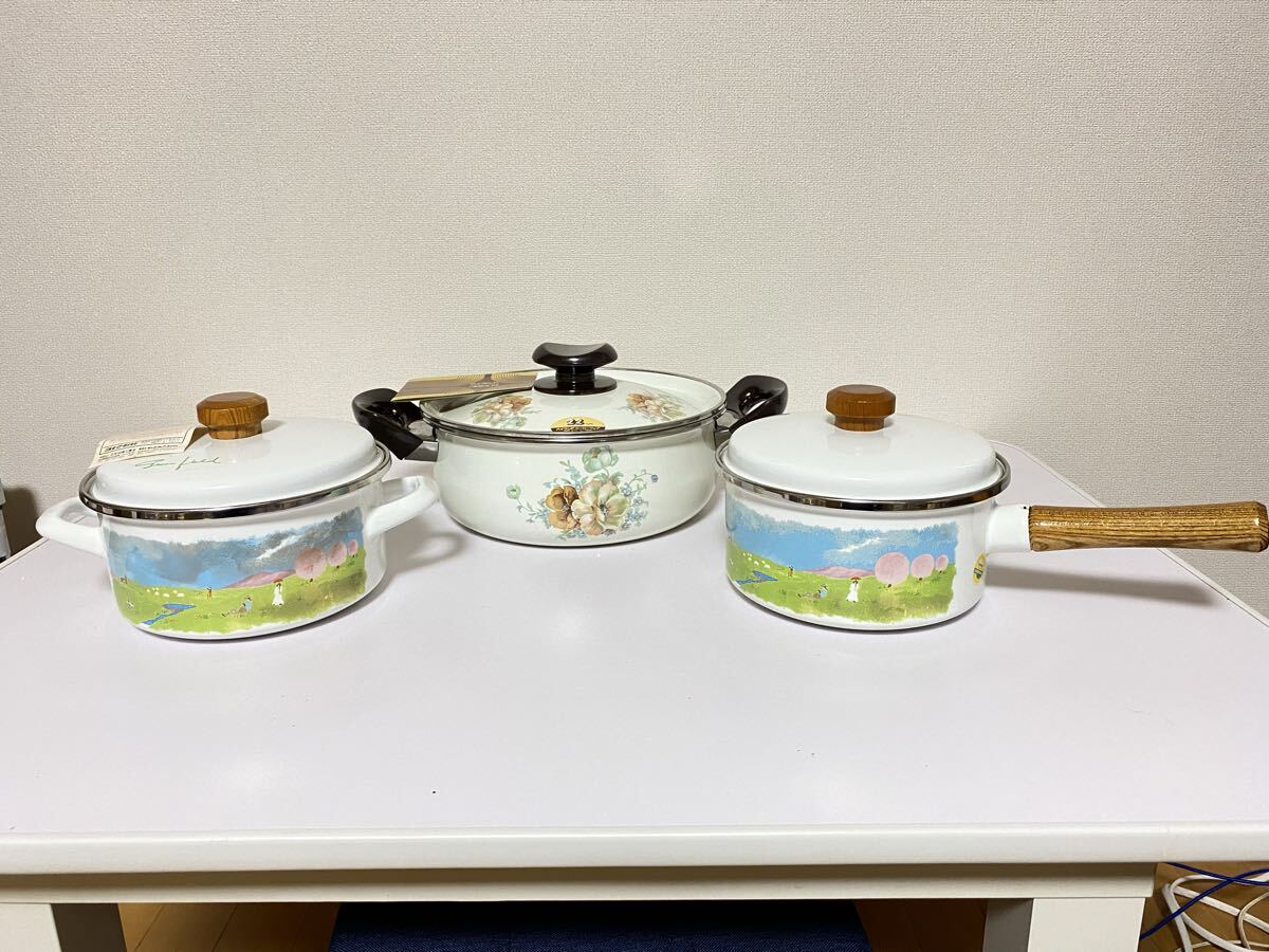 > Y10 ★未使用保管品 調理鍋 まとめ売り ホーロー鍋 花柄 両手鍋 昭和レトロ 調理器具 片手鍋 両手鍋 キッチン 琺瑯 ホーロー