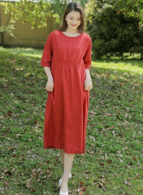 - ワンピース 無地 シンプル チュニック Aライン ナチュラル 高質 麻100% リネン ゆったり サラサラ レッド