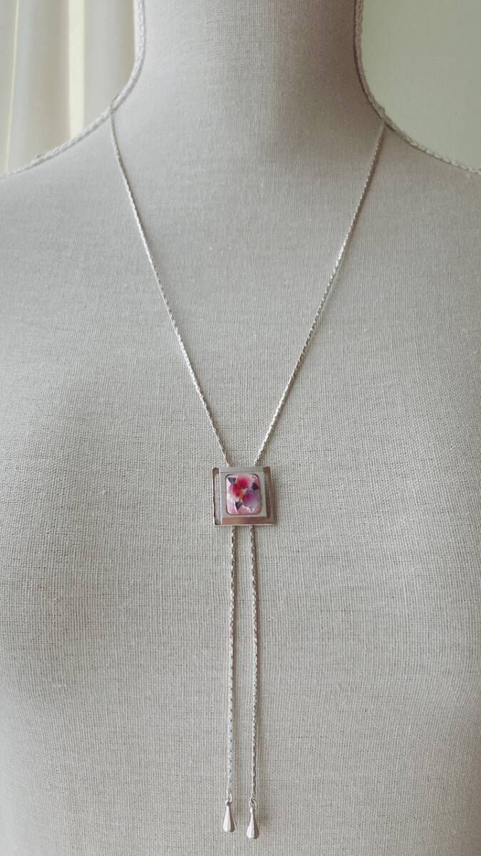 > ループタイネックレス スライダーペンダント フラワー ピンク シルバートーン PAT 美品☆vintage jewelry accessories F0025