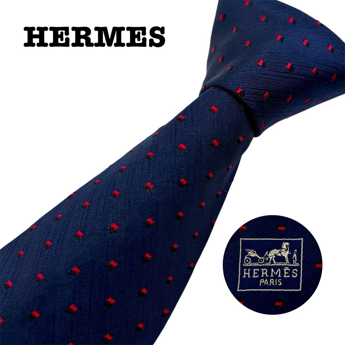 - 【●極美品/超希少】●HERMES エルメス ブルー 青 ネイビー 紺 ネクタイ シルク H柄 刺繍 総柄 ビジネス スーツ シャツ カフス 通勤