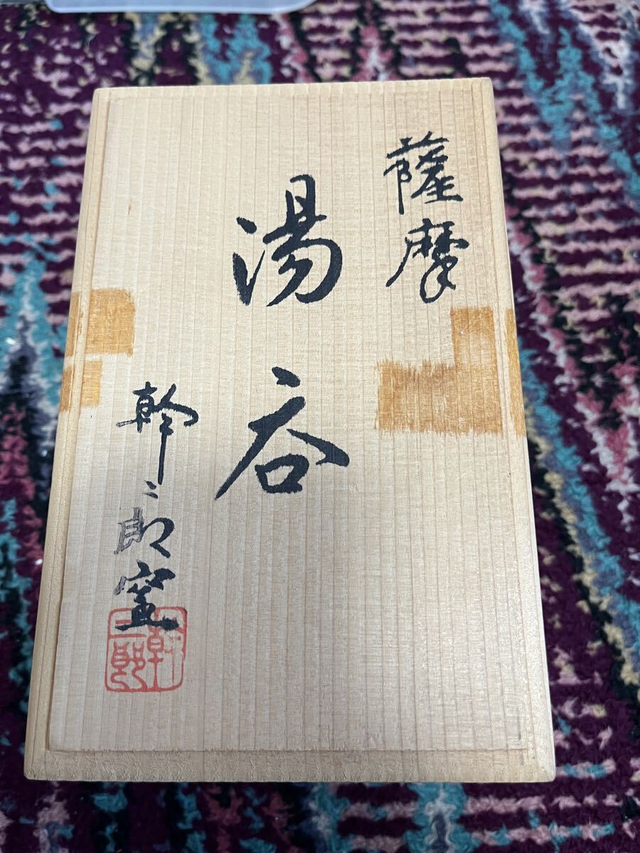 - 薩摩 湯呑 幹ニ郎窯 箱入の湯呑2個。未使用と思いますが年数が経過していきます。箱にセロハンテープ跡。