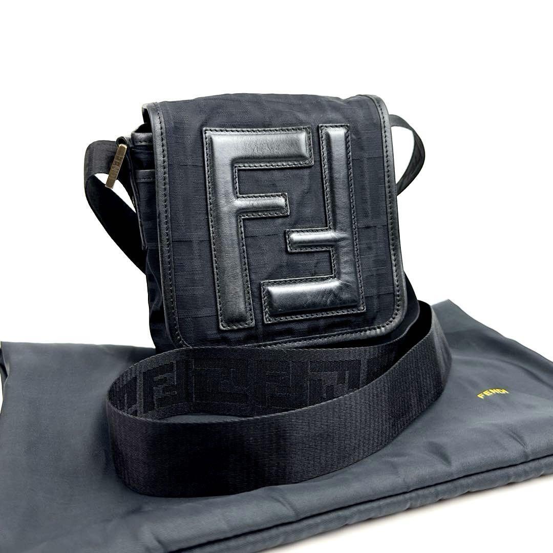 - 【極美品】FENDI フェンディ ショルダーバッグ ズッカ 総柄 FFロゴ ポシェット 斜め掛け ナイロン レザー 黒 ブラック フォーマル 男女兼用