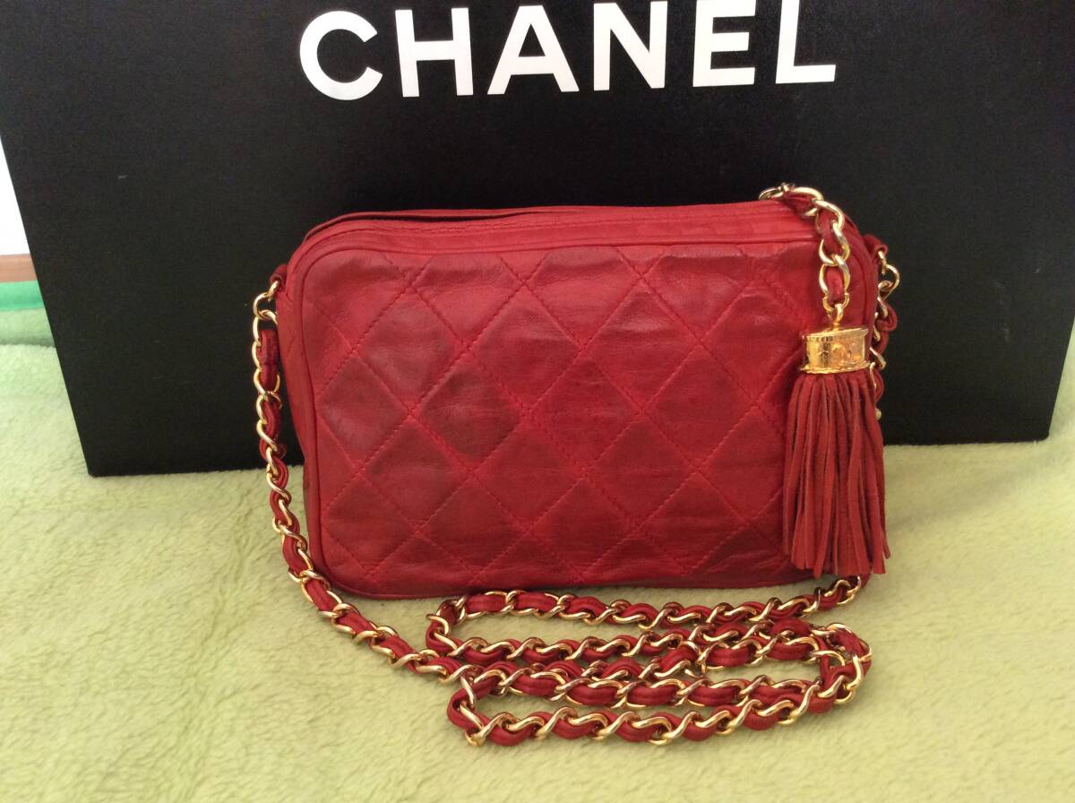 - 53.シャネル チェーンショルダーバッグ ミニマトラッセ タッセル ラムスキン レッド ゴールド金具 CHANEL