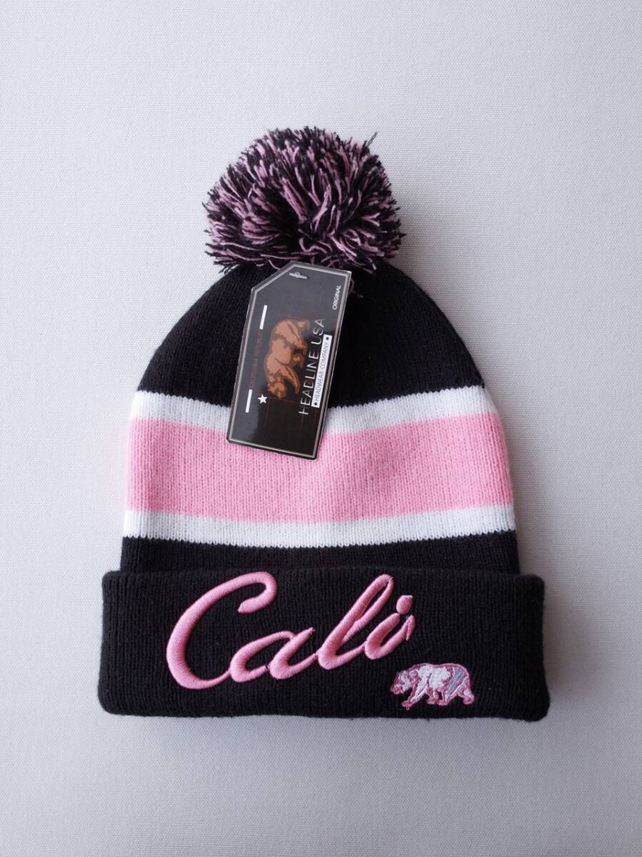 > 【新品・タグ付き】 カリフォルニア California Republic ニットキャップ ボンボン付き 黒×ピンク アクリルニット帽