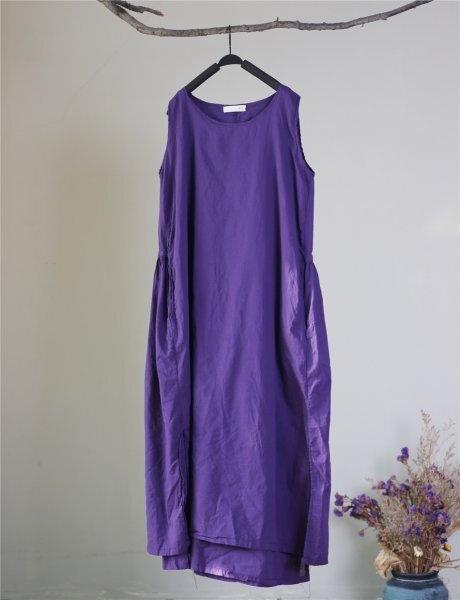 - xn ワンピース ノースリーブ 2重 トップス ゆったり サラサラ アンティーク風 ロマンファッション 純色 綿100% コットン パープル