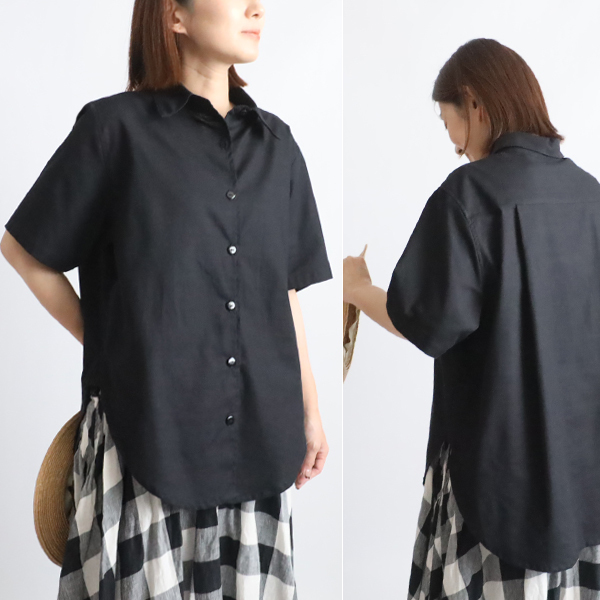 > 秋SALE 上質ギマ擬麻コットン 後ろ姿も抜かりない 背中丸み シャツ ジャケット 半袖 抜き襟 ゆったり ブラック F13C