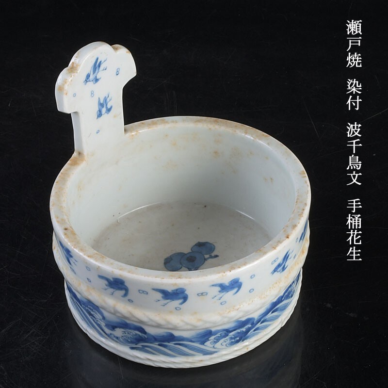 - 瀬戸焼 染付 波千鳥文 手桶花生 VCZJ