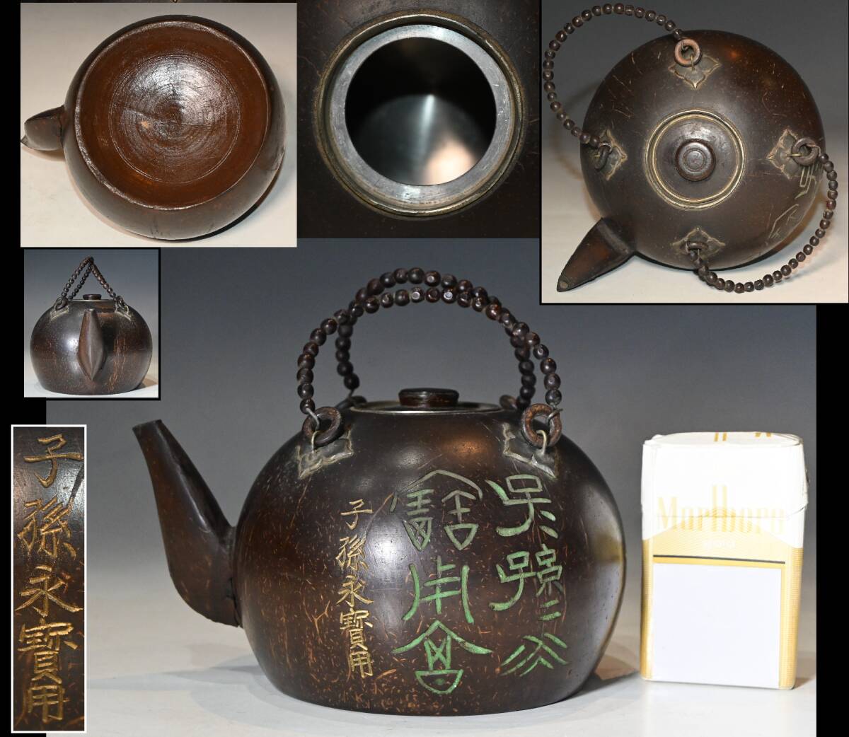 - 中国美術 時代 椰雕 椰子皮内錫製 漢詩彫 茶壷 茶器 急須 煎茶道具 茶注 錫器 椰子の実細工 子孫永寶 古玩 唐物 伝統工芸 金工 / 海南椰雕