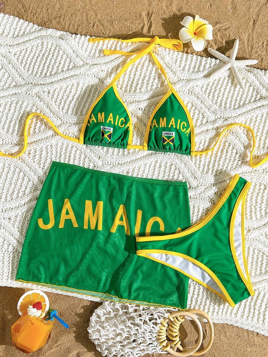 - レディース 水着 ビキニセット 3点セットレディース 夏ビーチ水着 - ビキニトップ、ボトム、スカート、イエローグリーン、ジャマイ