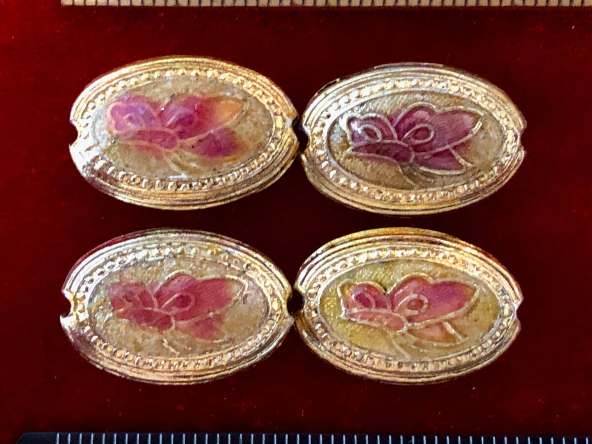 > ¶!¶ 有線七宝焼ワールド - 4色楕円円盤玉で1単位 ¶!¶ 約厚6㎜×13㎜×20㎜ 金線に土色釉澄紅蝶々 手作り 手芸 工芸 インテリア 趣味