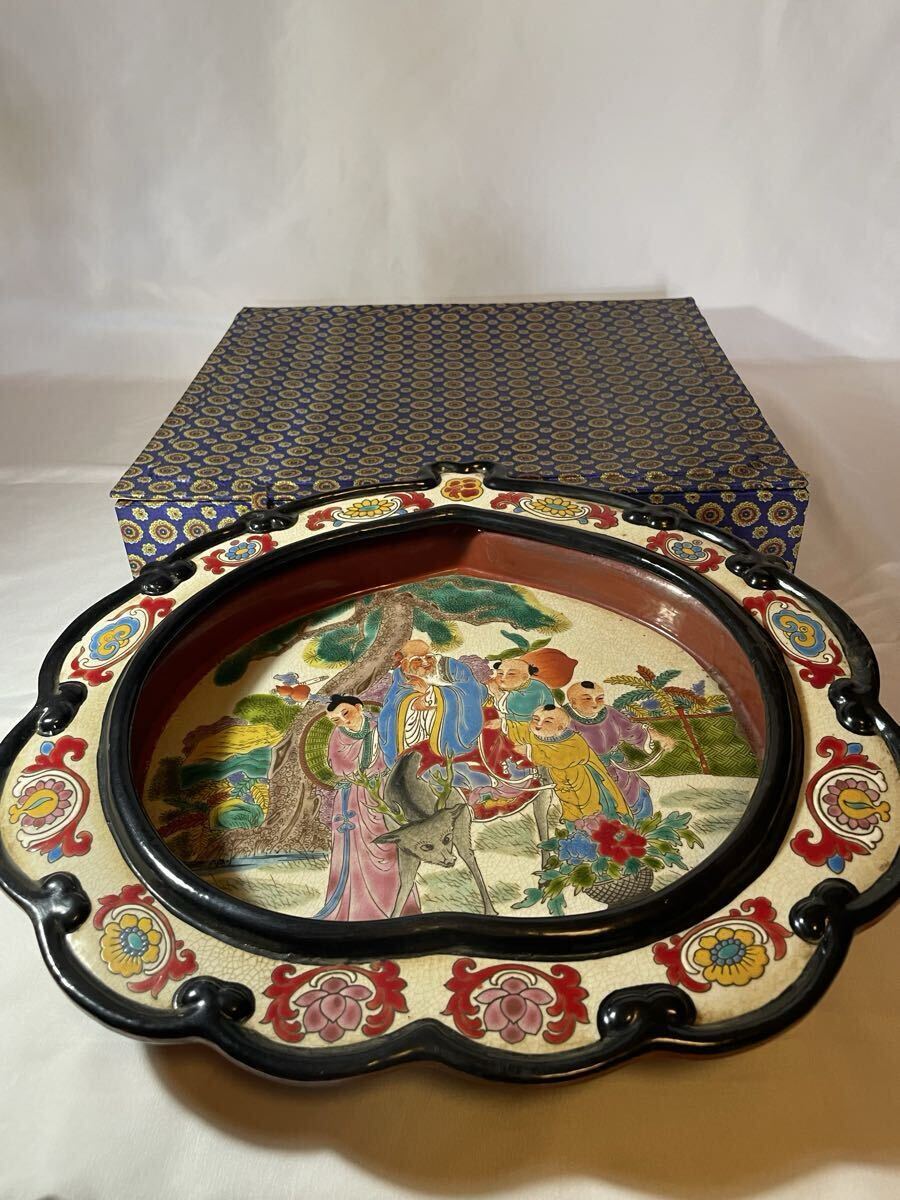 > 【送料無料】明大加彩人物画大皿 約W38D36H6cm 大明萬暦年製 天女 仙人 子供 鹿 飾り皿 中国古玩 古美術品 置物 時代物