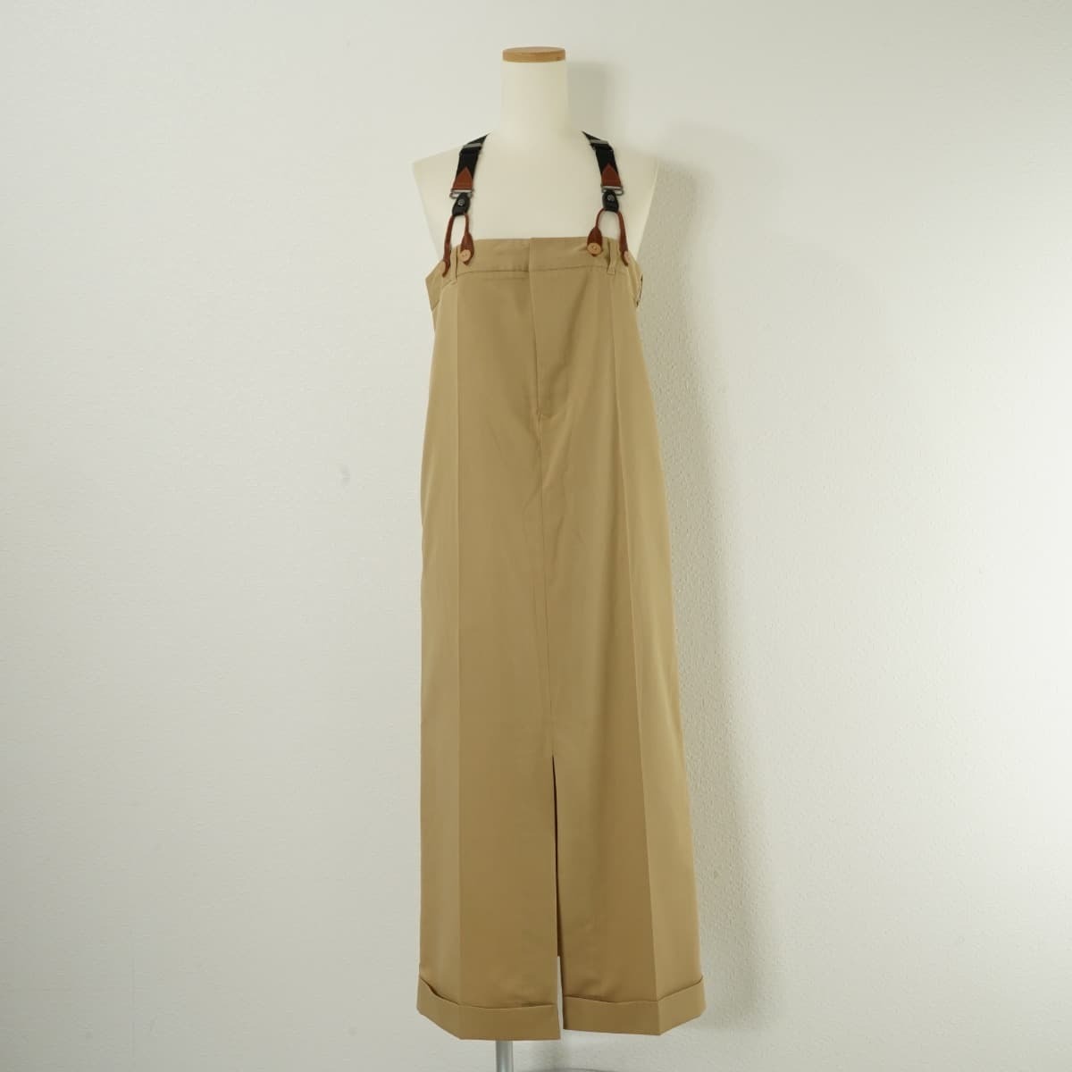 コメント:大きなパンツをリメイクしたようなデザインが特徴のワンピース。ジャンパースカートパンツをロールアップしたように見える裾と、本皮で作ったサスペンダーがポイントのアイテムです。
