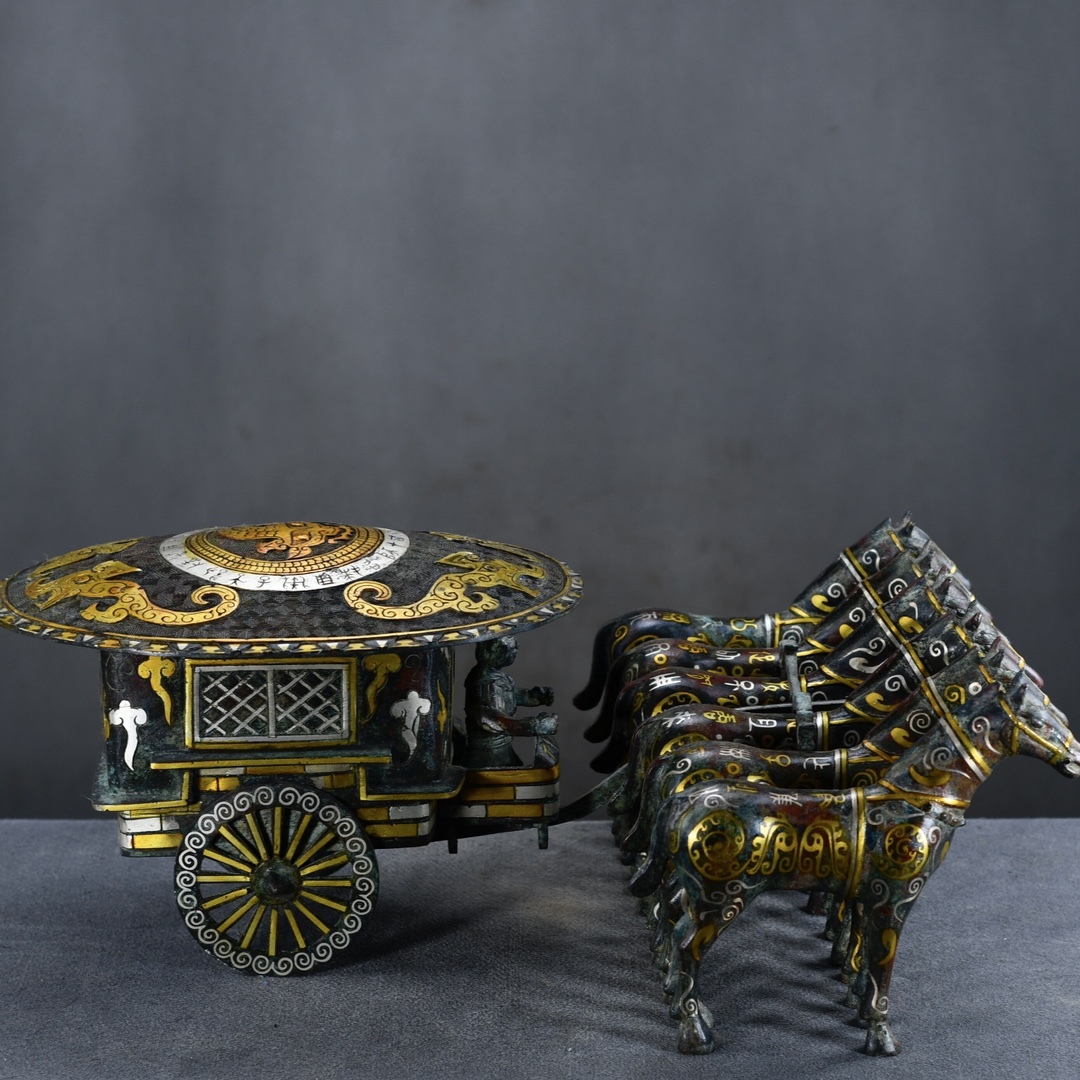 > ◆珍蔵◆中国古美術 漢代 古銅製 青銅器 錯金 錯銀 銘文馬拉車 精品 細密細工造 置物 擺件 古賞物 骨董 時代物 AT17
