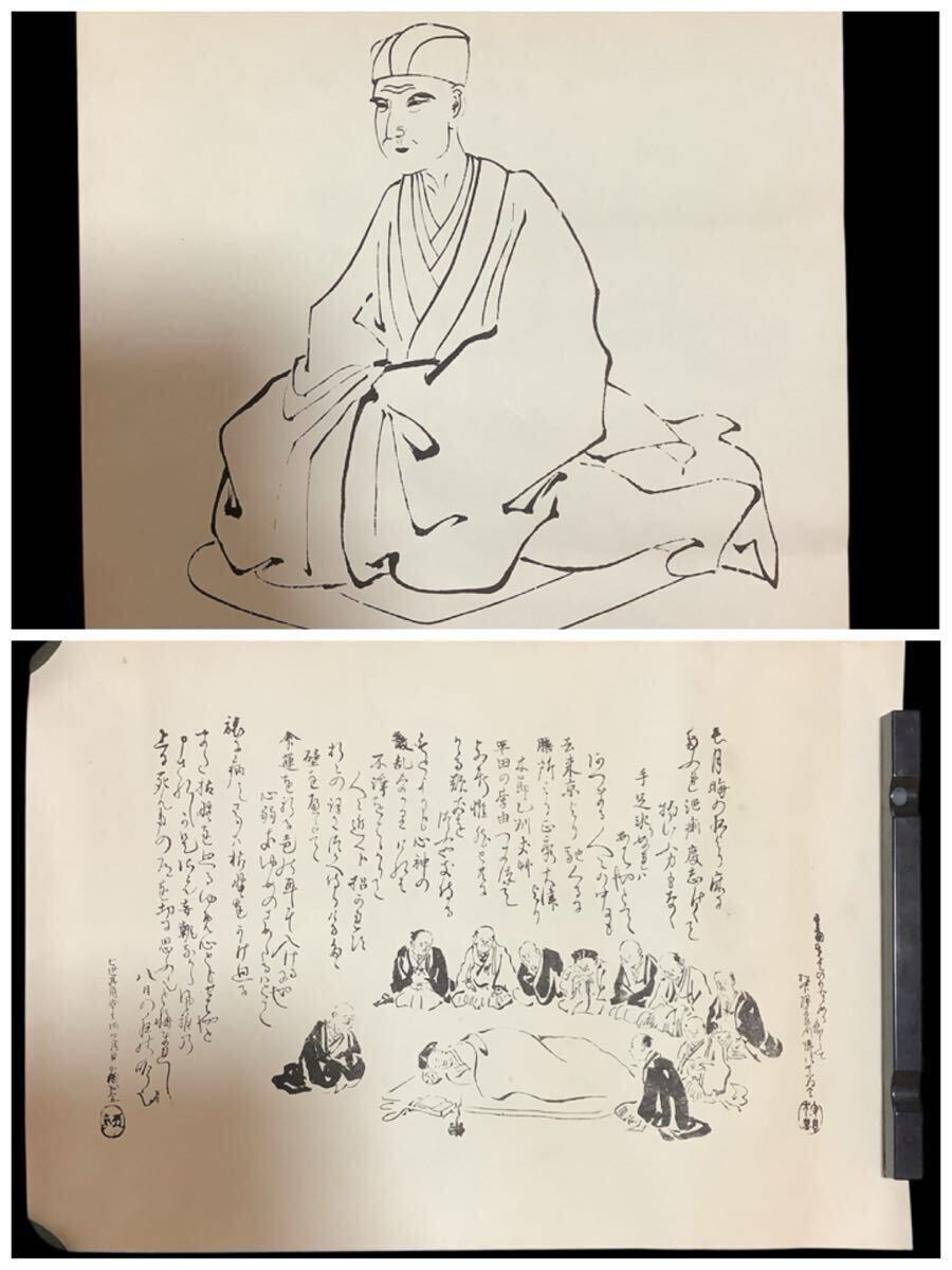 - 和書2枚Sep741[松尾芭蕉涅槃図(終焉記) 肖像画]紙本版摺 木版画/送料600円 宝井其角 俳句 俳人 古書 古文書