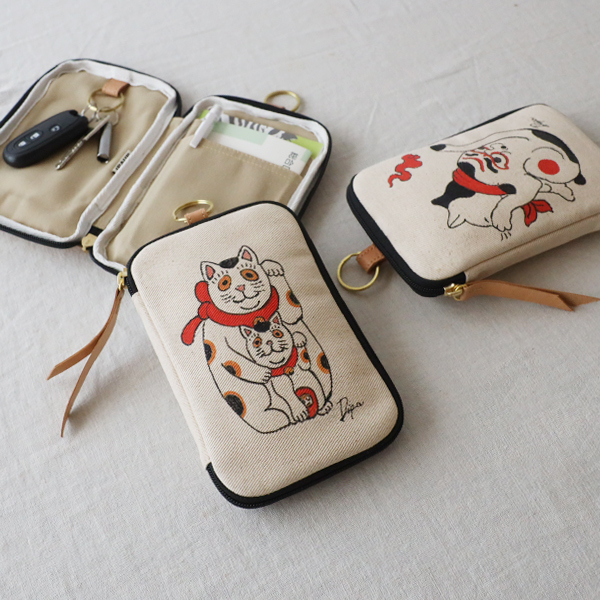 - 芸術の秋SALE Lサイズ 手描きART クッション 生成りデニム キーケース お薬手帳ケース 招き猫 S04A
