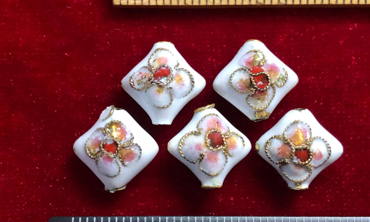 - ¶!¶ 有線七宝焼ワールド - 5個の菱型玉で1単位 ¶!¶ 約厚8㎜×12㎜ 金線に白釉ピンク花紋様 手作り 手芸 工芸 インテリアペンダント