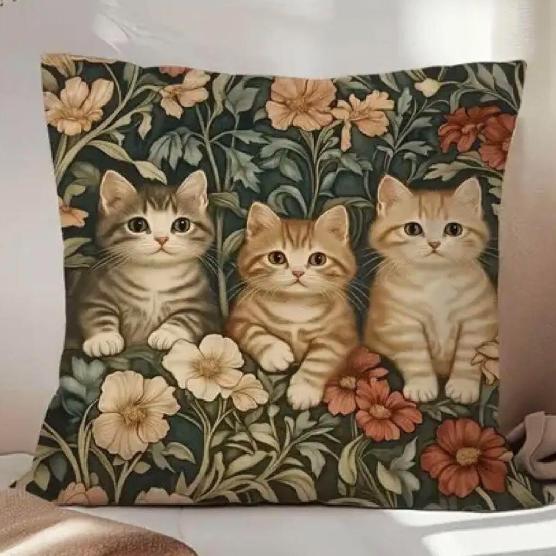- 新品 クッションカバー 刺繍風 プリント 猫 ネコ 動物 リアル かわいい