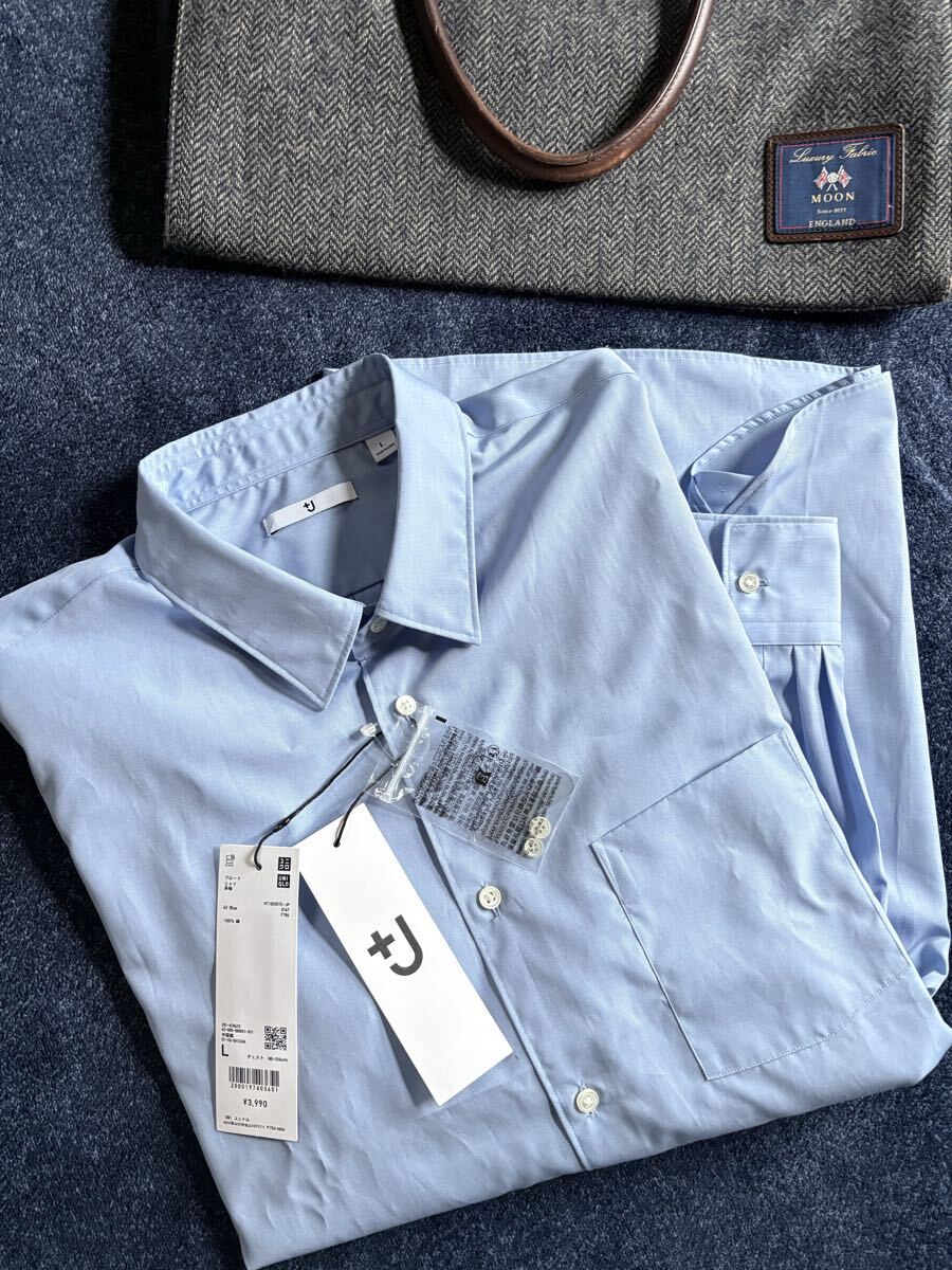 - 新品 定価3,990円 UNIQLO +J ユニクロ ジルサンダー コラボ 襟スタンダード ブロード 長袖シャツ sizeL チェスト96-104cm ブルー系