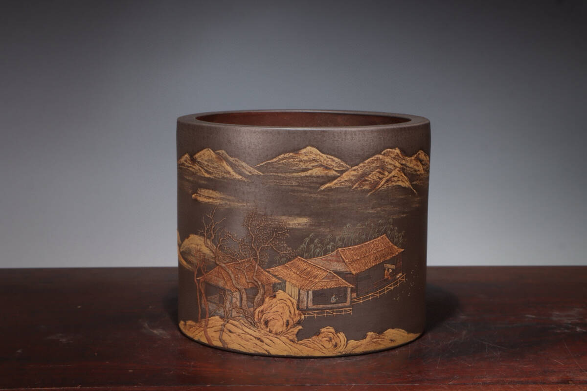 - 『古』【底款・楊季初 山水筆立】重量1639g 朱泥 段泥 煎茶道具 急須 単孔口 唐物 孟臣 紫砂壺 紫砂壷 茶壷 茶壷 明代/清代