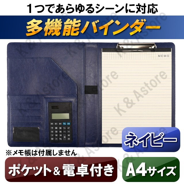 - バインダー A4 クリップボード 二つ折り ファイルボード 革 PUレザー 多機能 ペンホルダー カードポケット付き 名刺入れ ビジネス ネイビー