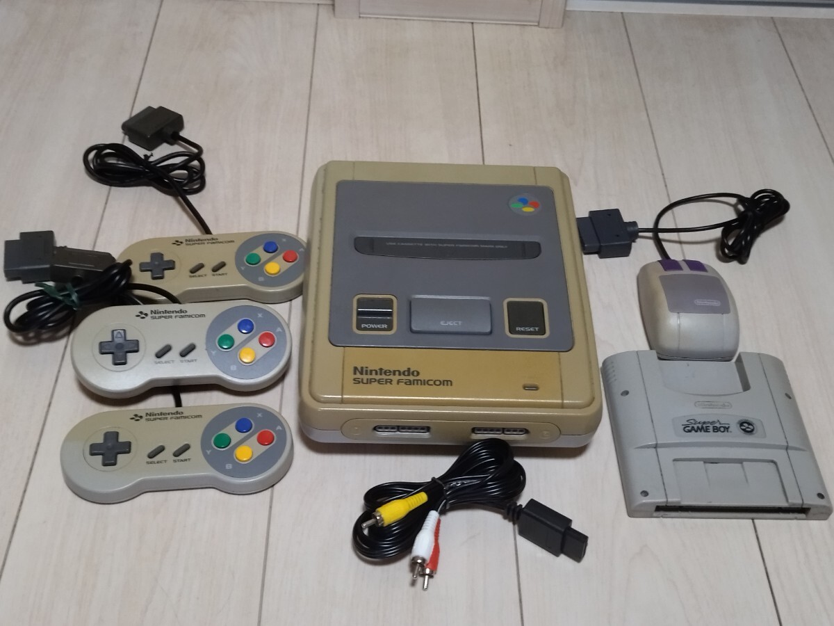 - 即決SFC スーパーファミコン本体一式 ソフト4本 純正コントローラーパッド3個 純正スーパーゲームボーイ 純正マウス ステレオAVケーブル