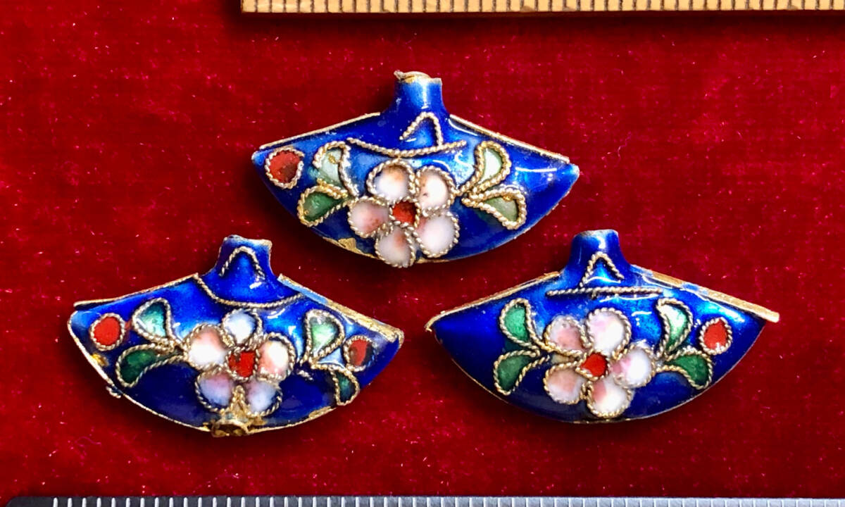 > ¶!¶ 有線七宝焼ワールド - 3個の扇子型ペンダントで1単位 ¶!¶ 金線に藍色釉ピンク花緑葉 手作り 手芸 工芸 インテリア ペンダント
