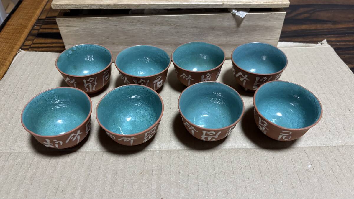 - 松本市発 唐物 時代 朱泥 内緑青釉 石泉竹炉 煎茶碗 8客 煎茶茶碗 茶道 茶道具 中国 紫砂 未使用中古