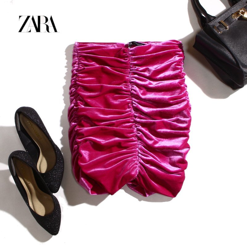 > 美品 ZARA ザラ 光沢 艶 ベロアスカート シャーリングギャザー タイトスカート XS マゼンタピンク 派手 イベント コンサバ 綺麗め