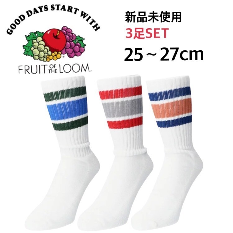 - 新品 フルーツオブザルーム クルー丈 ラインソックス A柄 3足 25-27cm FRUIT OF THE LOOM 70079200 ライン 3PAIR SOCKS 靴下