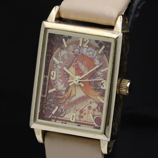 > 稼働 ブルーブリュエ ミュシャ ペインティングウォッチ スクエア QZ アイボリー/ボルドー文字盤 レディース腕時計 TKD 2000000 NSK