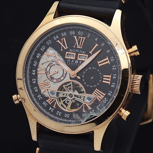 - 岩城滉一プロデュース ゾンネ×ハオリ AT/自動巻 H003 ディデイト ローマン 裏スケ ラウンド 黒×スケルトン文字盤 メンズ腕時計 STU