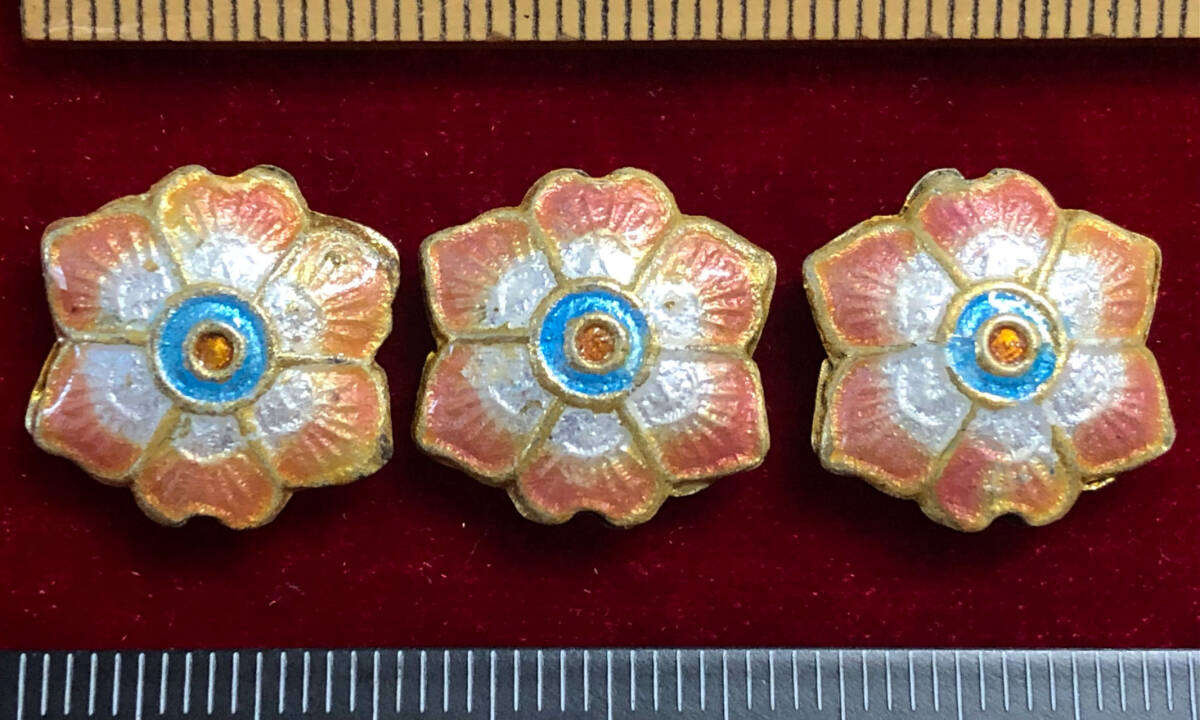 > ¶!¶ 有線七宝焼ワールド - 3個の六角花型ペンダント ¶!¶ 約厚5㎜×15㎜ 金線に橙白色釉水橙花芯 手作 手芸 工芸 インテリア ペンダント