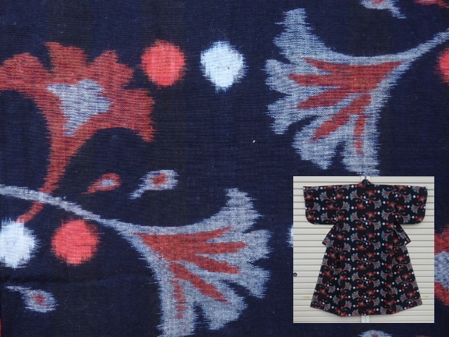 - ●木綿着物:16:●イチョウの葉:ドット●絣●藍染●仕付け糸●保存状態良好●