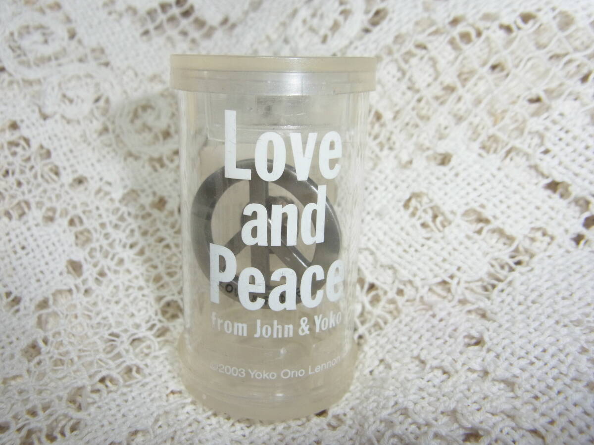 - ビートルズ☆ジョンレノン オノヨーコ ピンバッチ 「ラブアンドピース」2003 円筒形ケース 未開封