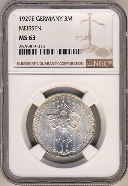 - ●ドイツ(ワイマール共和国) 1929年E NGC MS63 マイセン1000周年記念 3レイヒスマルク銀貨