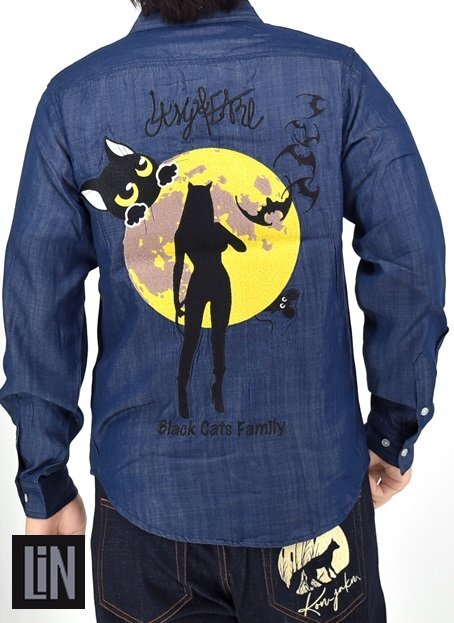 - ラミ&アール BLACK CATS FAMILY総刺繍長袖シャツ◆LIN ネイビー XXLサイズ AL-75805 黒猫 ネコ コウモリ ユニセックス